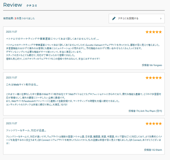 Отзывы клиентов, оставленные в вашем профиле компании в Google, автоматически импортируются на страницу вашего магазина на ぐるっと東京. Кроме того, отзывы переводятся и публикуются на нескольких языках. Благодаря этому «голос клиента» становится не разовым, а превращается в «актив», накапливаемый на сайте. Также вы можете выбирать, какие отзывы показывать. Чтобы попадать в рекомендации ИИ, важно увеличивать число отзывов — это повышает шансы, поэтому для заведений с большим количеством отзывов эта система особенно эффективна.